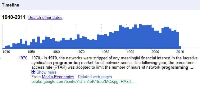 The Timeline search view shows a graph of your search term over time with key dates and events over time. You can see from this view the popularity of the search over a period of time. You can also click into the various date segments and drill down further into the information.